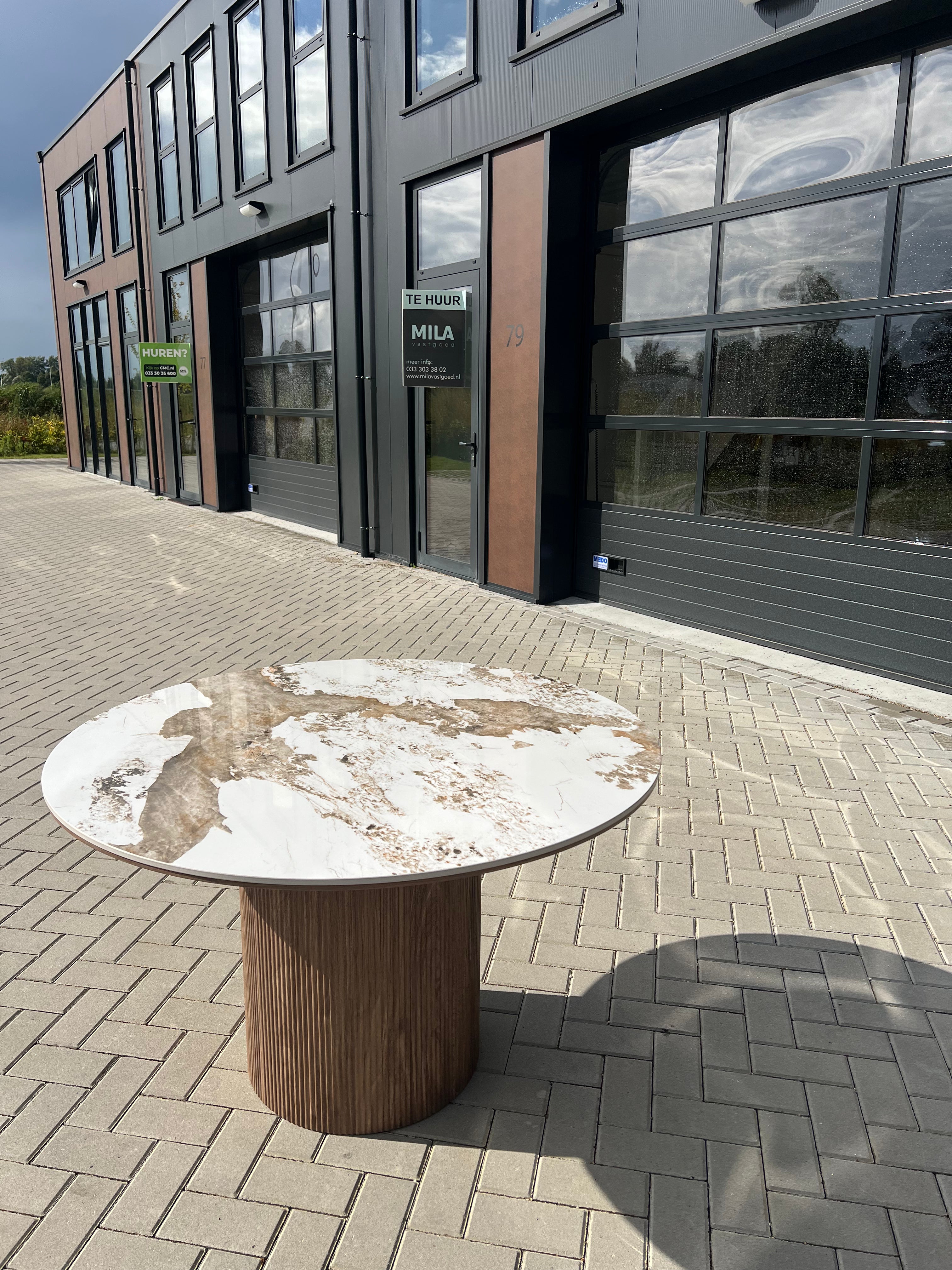 Japandi Eettafel Keramisch Tafelblad Wit/Donkereiken – Ø120x76 cm