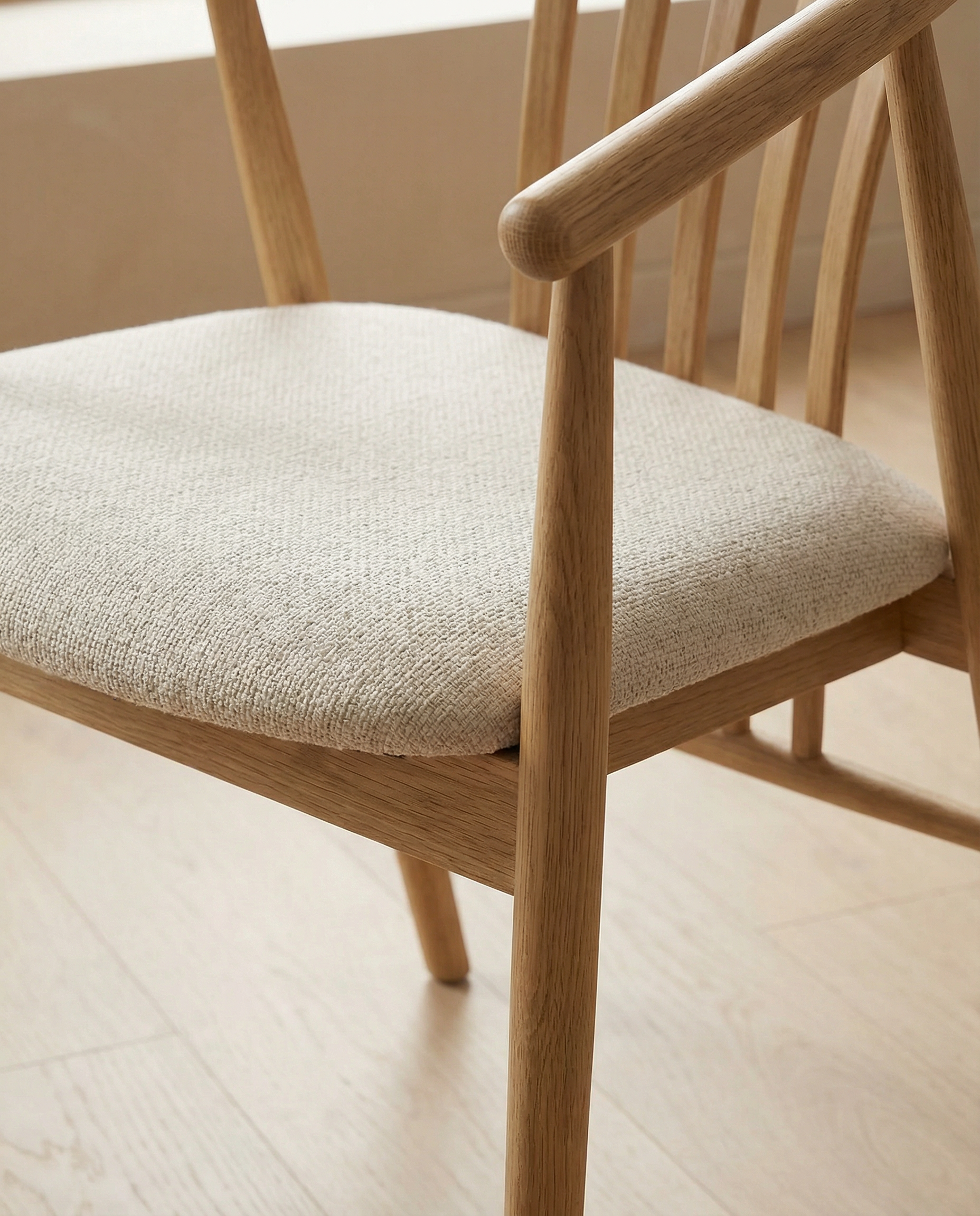 De Gusto eetkamerstoel combineert natuurlijke materialen met een verfijnd en tijdloos ontwerp. Het slanke frame van massief eikenhout geeft de stoel een warme, rustige uitstraling, terwijl de stoffen zitting zorgt voor aangenaam zitcomfort. De combinatie van hout en textiel maakt deze stoel bijzonder veelzijdig en passend binnen Scandinavische, Japandi en moderne interieurs.