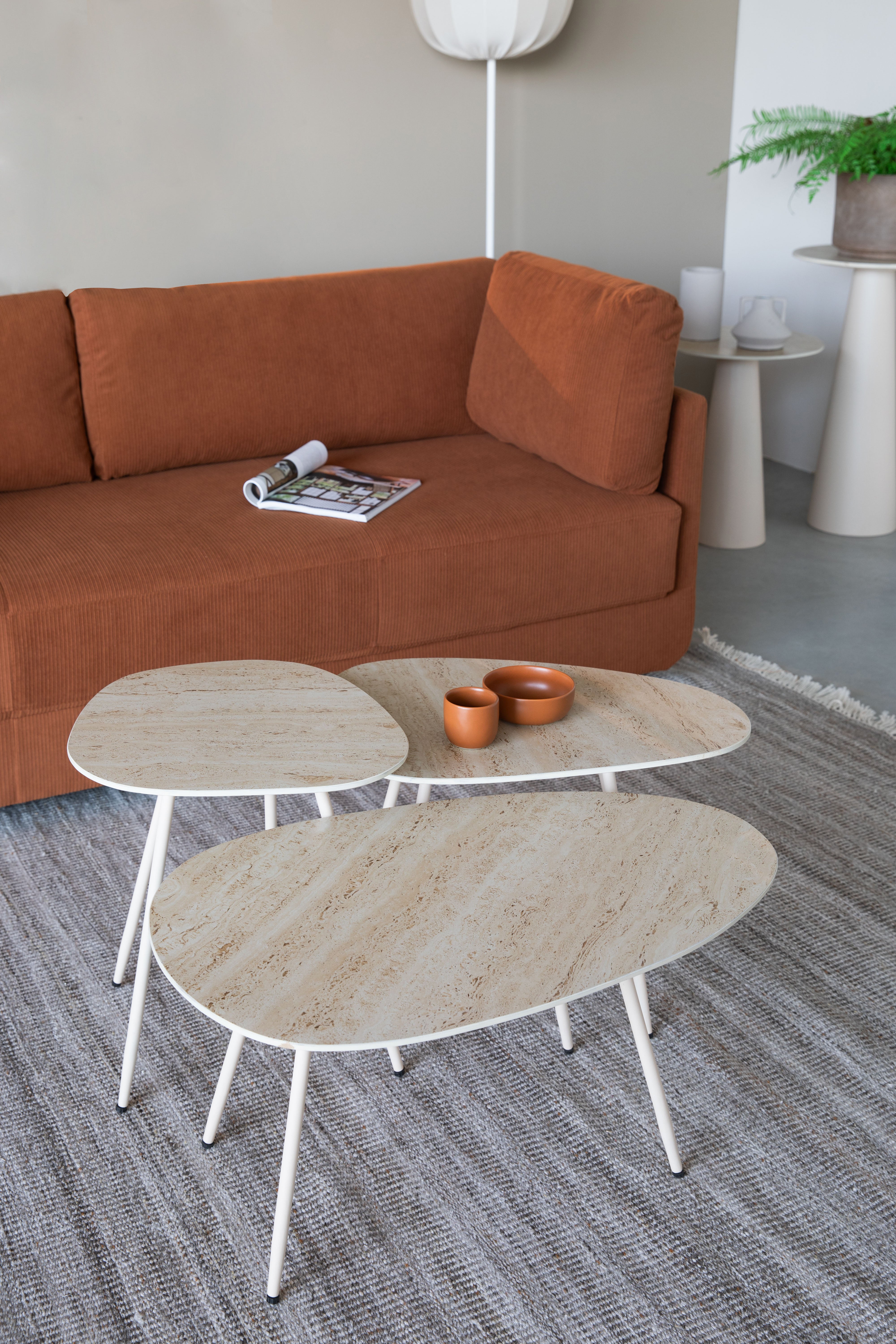 De Faiz bijzettafelset is een prachtige mix van keramische tafelbladen met een prachtige travertin afwerking en slanke metalen poten. De rustgevende beige tinten en travertin look voegen een vleugje elegantie toe aan elke ruimte. Met verschillende hoogtes kunnen deze drie tafels afzonderlijk of als een gezamenlijke set worden gebruikt, wat zorgt voor veelzijdigheid in je inrichting.