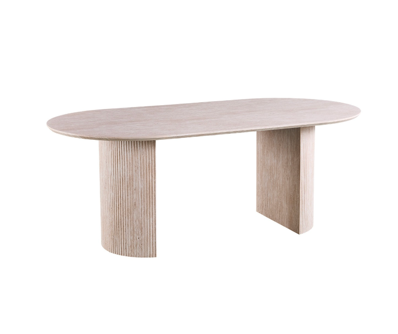 Deze ovale Japandi eettafel brengt een rustige, architectonische uitstraling in de ruimte. De zachte beige travertinlook geeft het ontwerp een verfijnde en natuurlijke sfeer, terwijl de ovale vorm zorgt voor vloeiende lijnen en visuele balans. Een ideale tafel voor serene eetruimtes waarin eenvoud, licht en harmonie centraal staan.