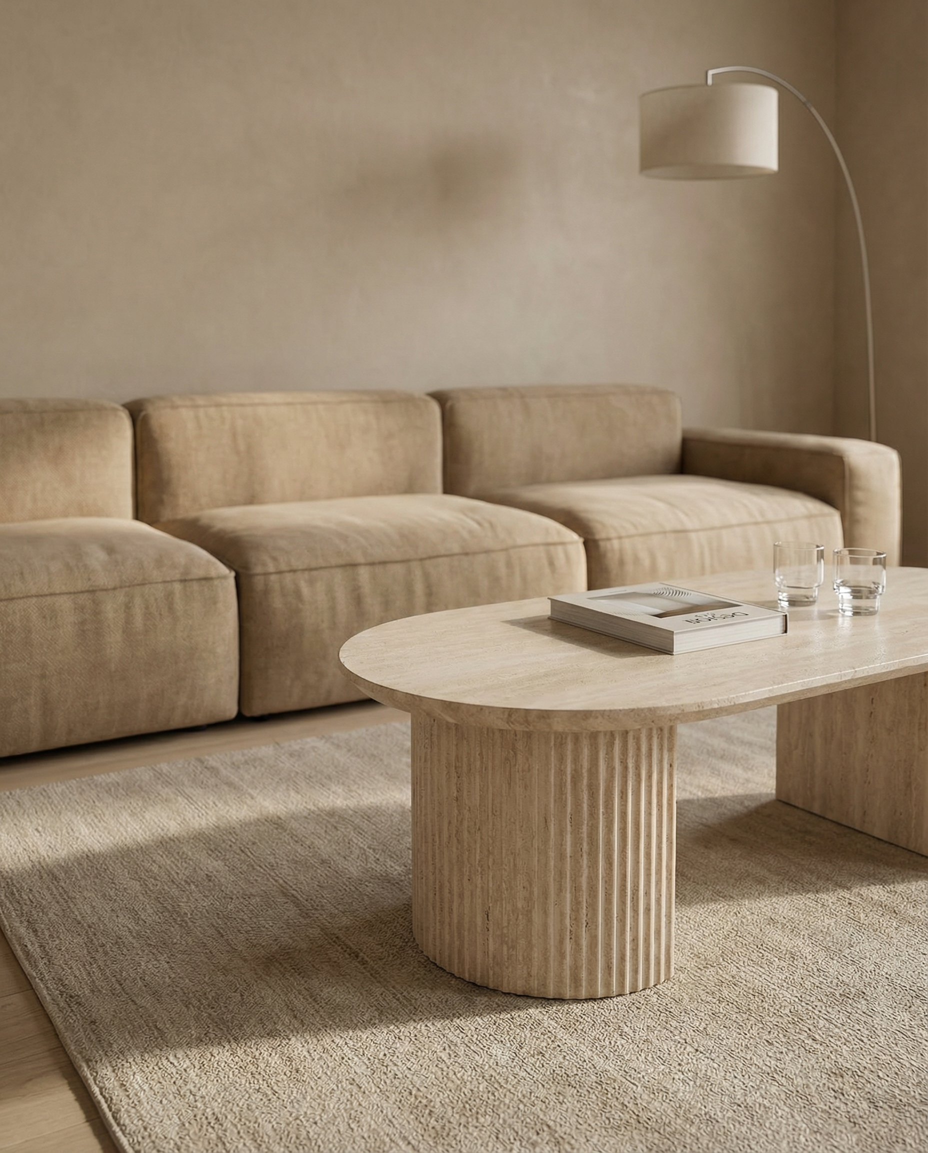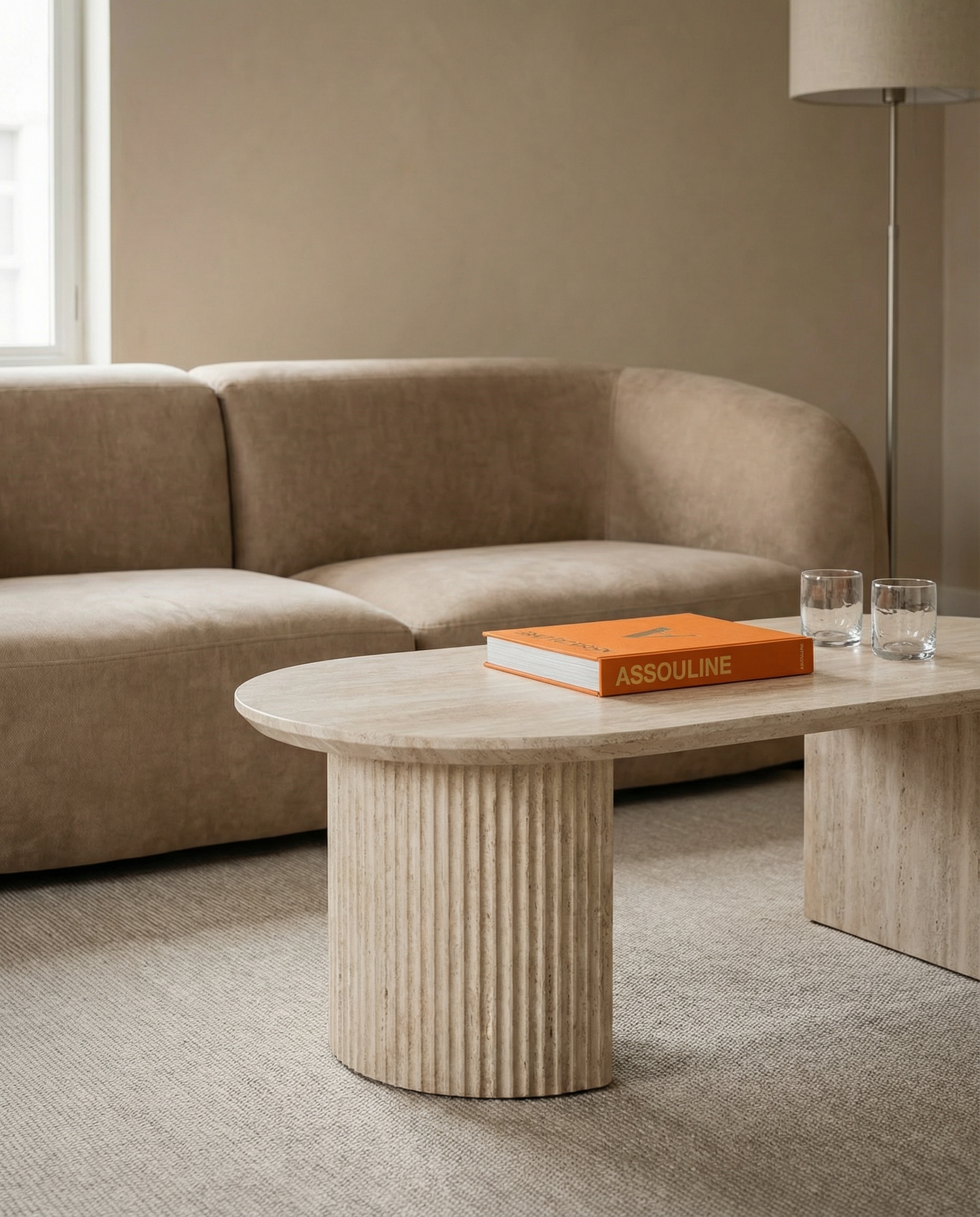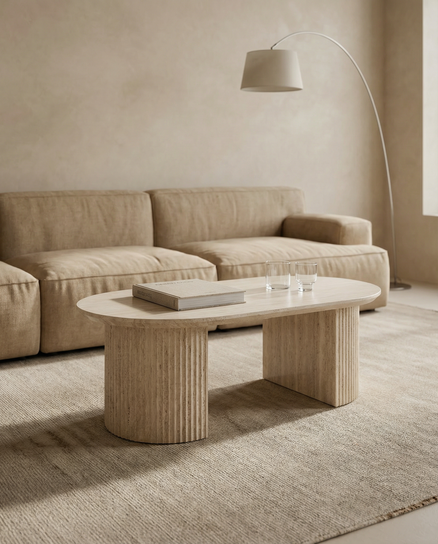 Deze ovale Japandi salontafel vormt het perfecte broertje van de bijpassende eettafel en brengt dezelfde rustige, architectonische uitstraling naar de zithoek. De zachte beige travertinlook geeft het ontwerp een verfijnde en natuurlijke sfeer, terwijl de ovale vorm zorgt voor vloeiende lijnen en een harmonieuze balans in de ruimte.
