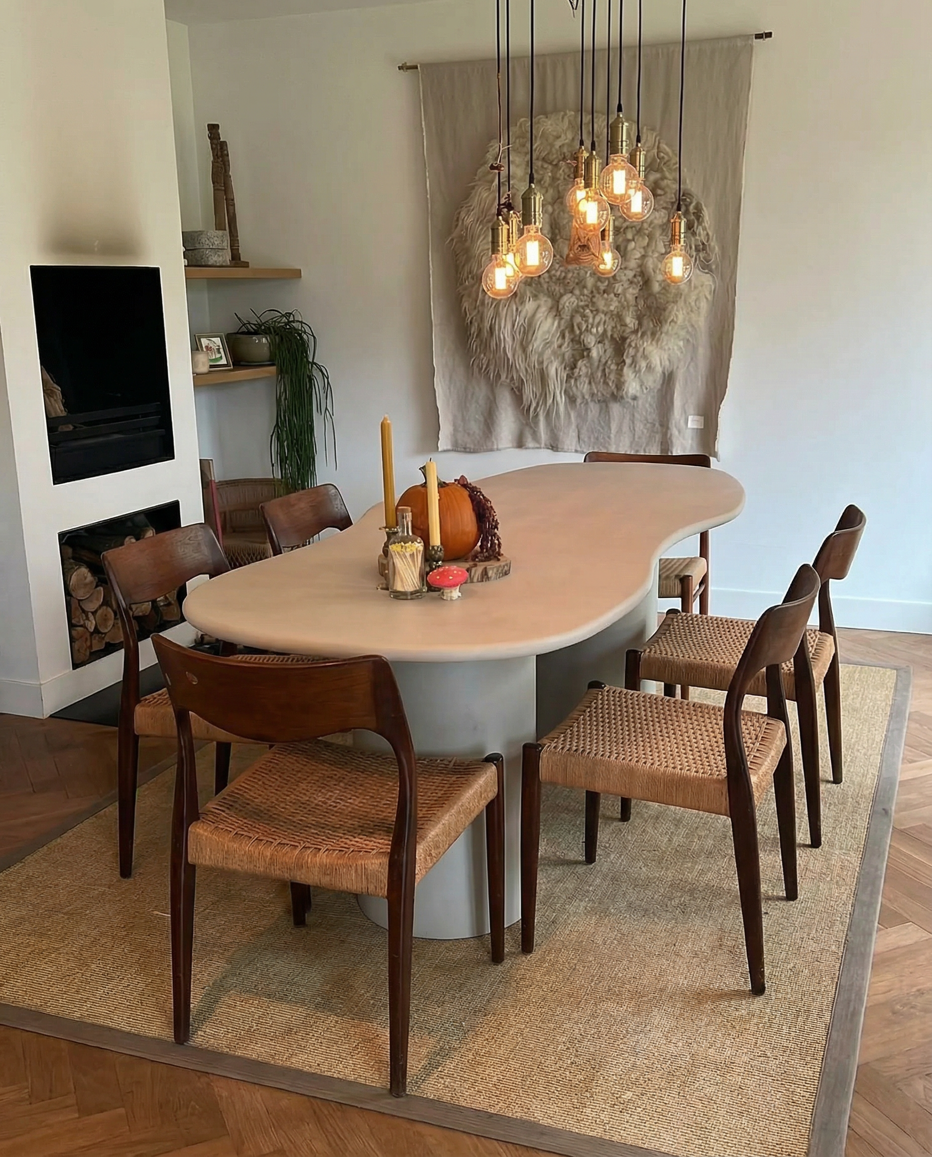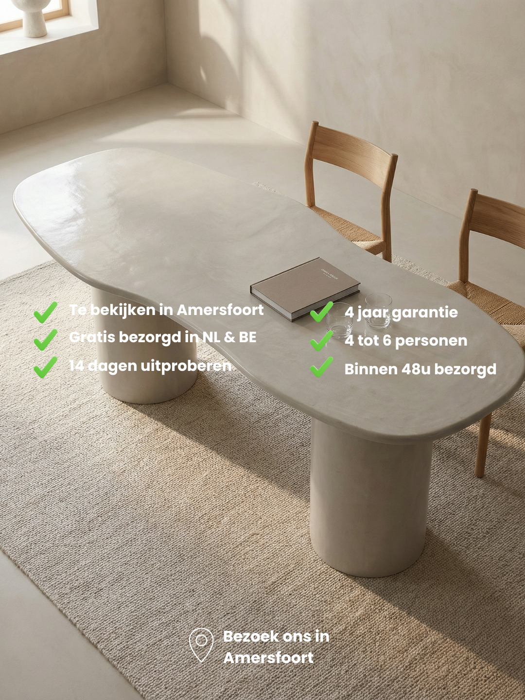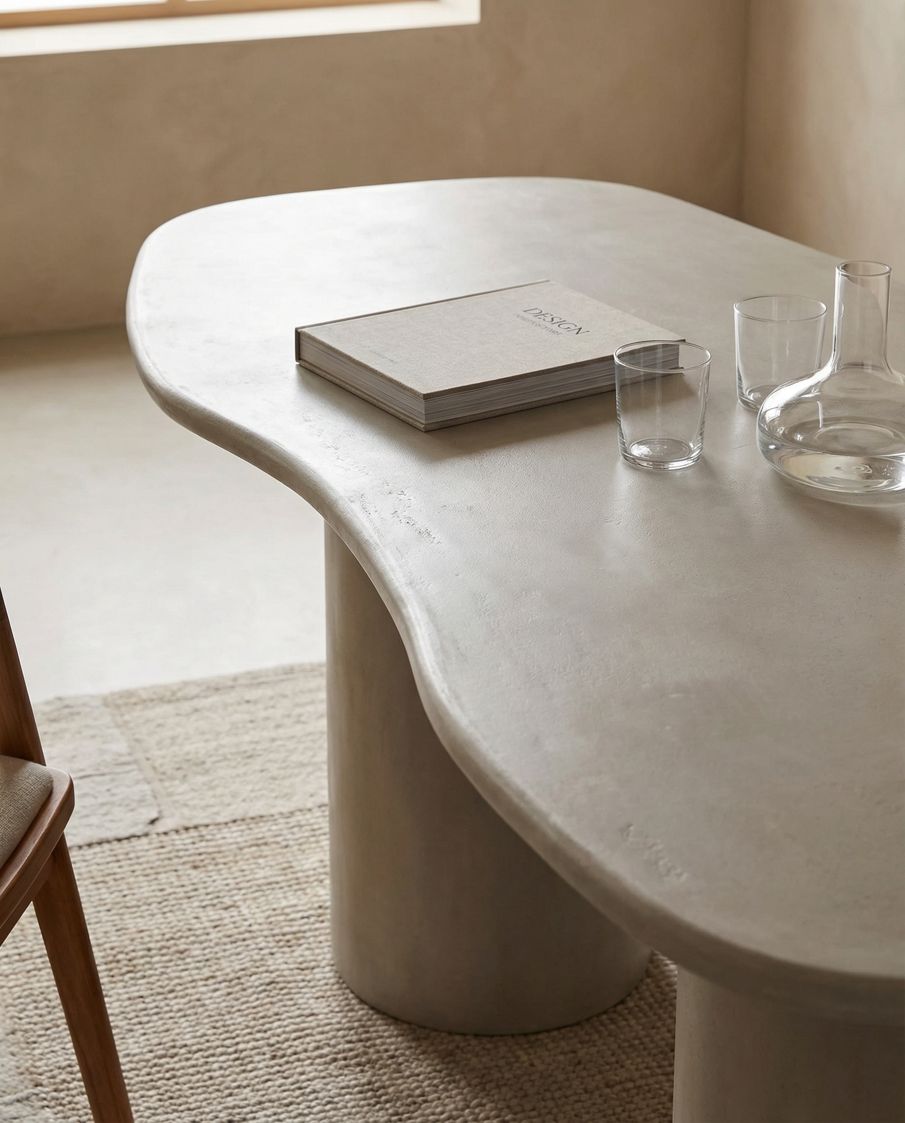 Een verfijnde eettafel met een zachte betonlook. De organische vorm en rustige afwerking zorgen voor een tijdloze uitstraling die moeiteloos past in een modern, Japandi of Scandinavisch interieur.